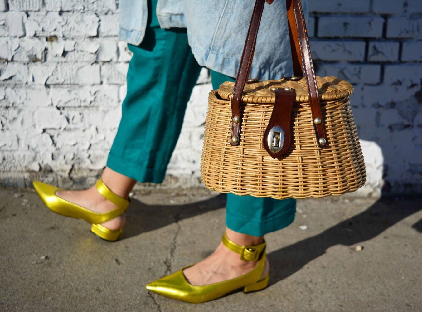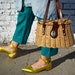mini fisherman basket purse with brass and leather closure and details. small internal pocket. leather handles.